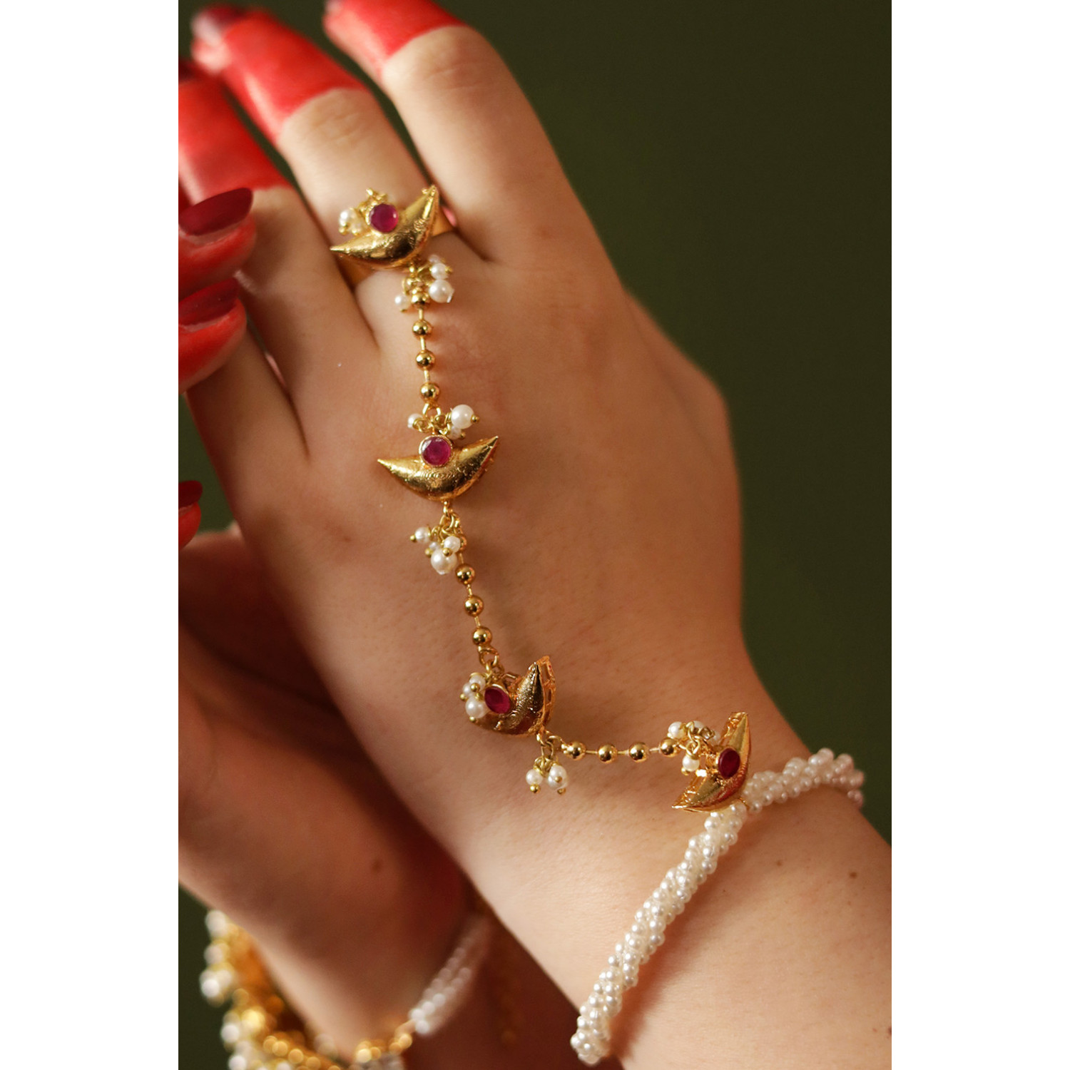 18k gold plated, Kundan and chatham pink stone zircons with white pearls setting.