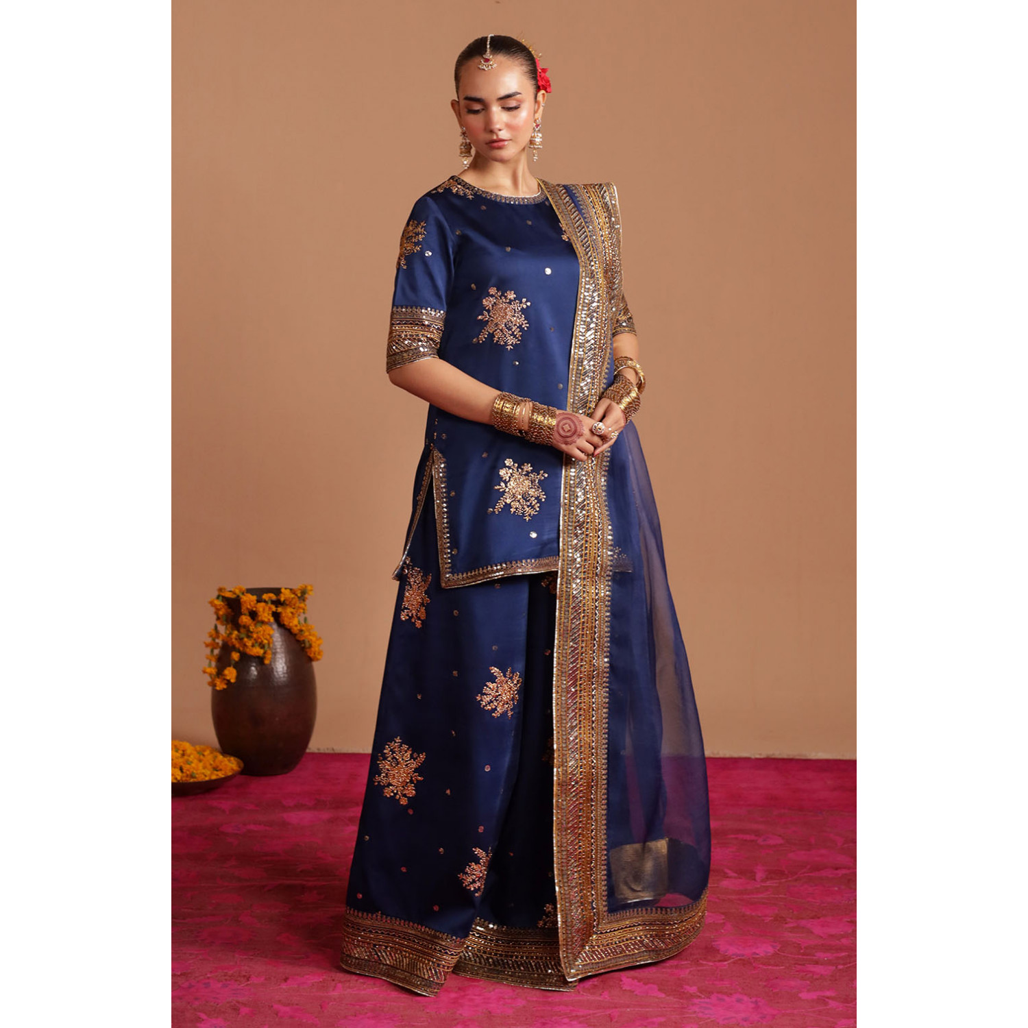 Cobalt Blue shamooz silk short shirt with sharara pants with tilla, badla and sequin embroidery with an organza dupatta.