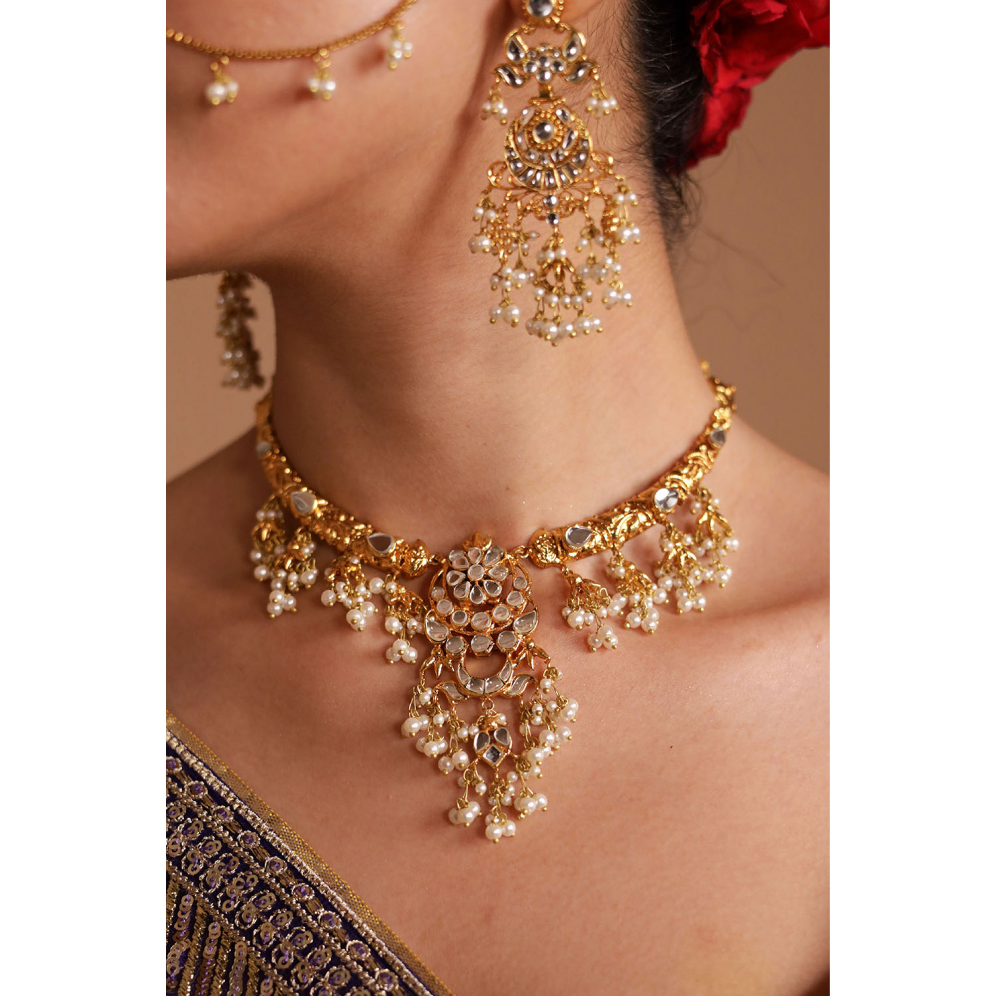 18k gold plated, Kundan, pink stone, zircons with white pearls setting.