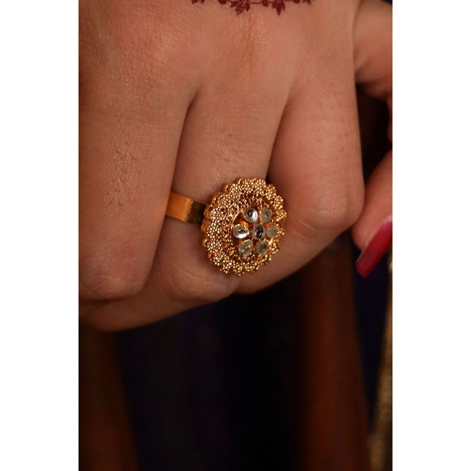 18k gold plated, kundan, amozanite  natural stone with off white pearls setting.(adjustable ring, no size required).