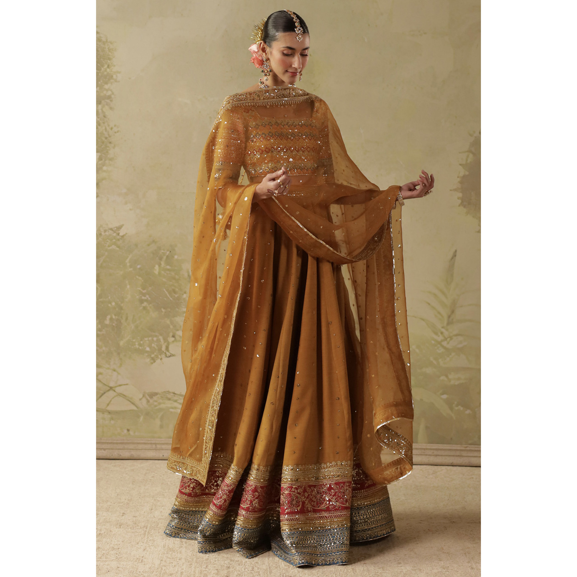 Gold leaf Bamber silk lehenga with multicolor choli with badla, tilla, sequin and resham embroidery paired with an organza multihead embroidery.