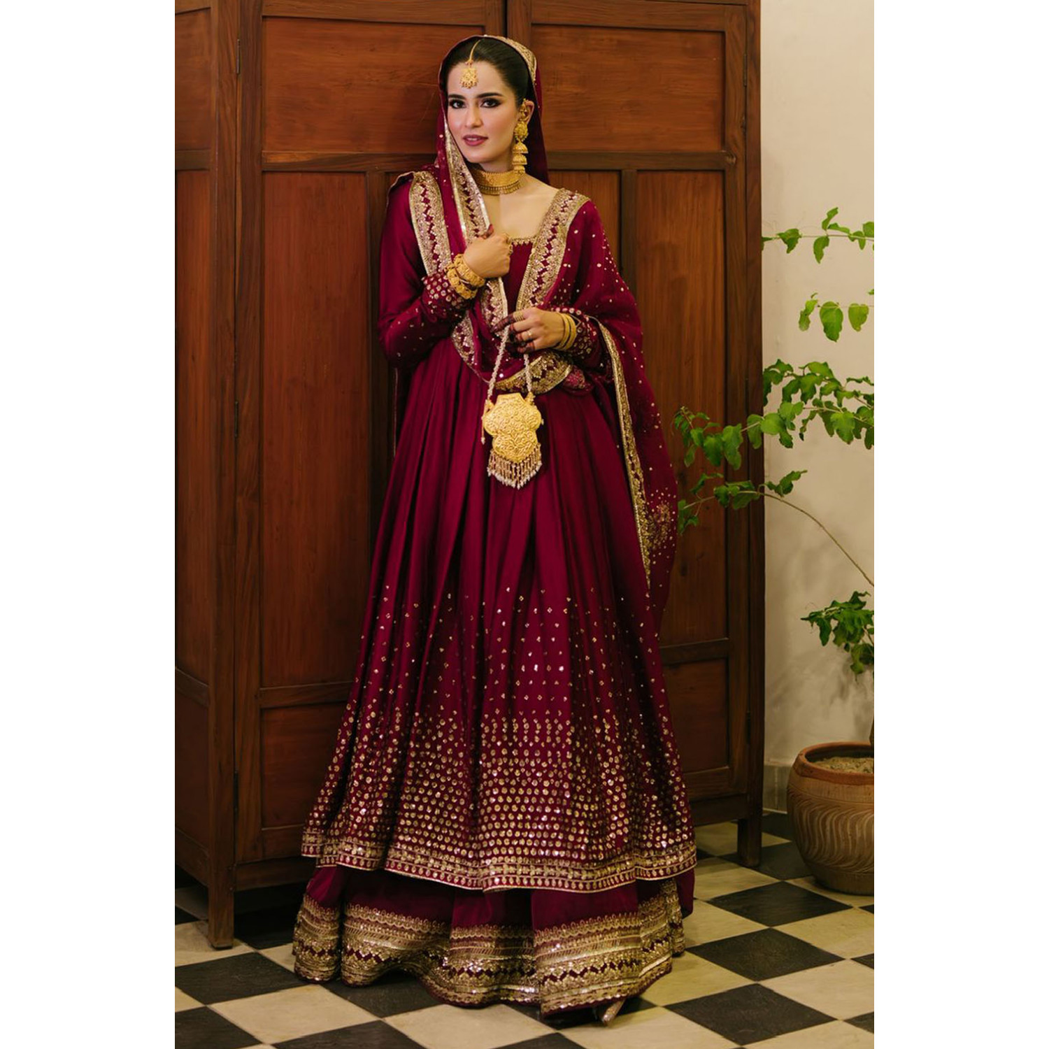 Anari shamooz anarkali adorned with a multi-head heavy sequin spray hem complemented with hand adda work neckline paired with shamooz silk lehenga with border heavily embellished with hand adda work on multihead base.