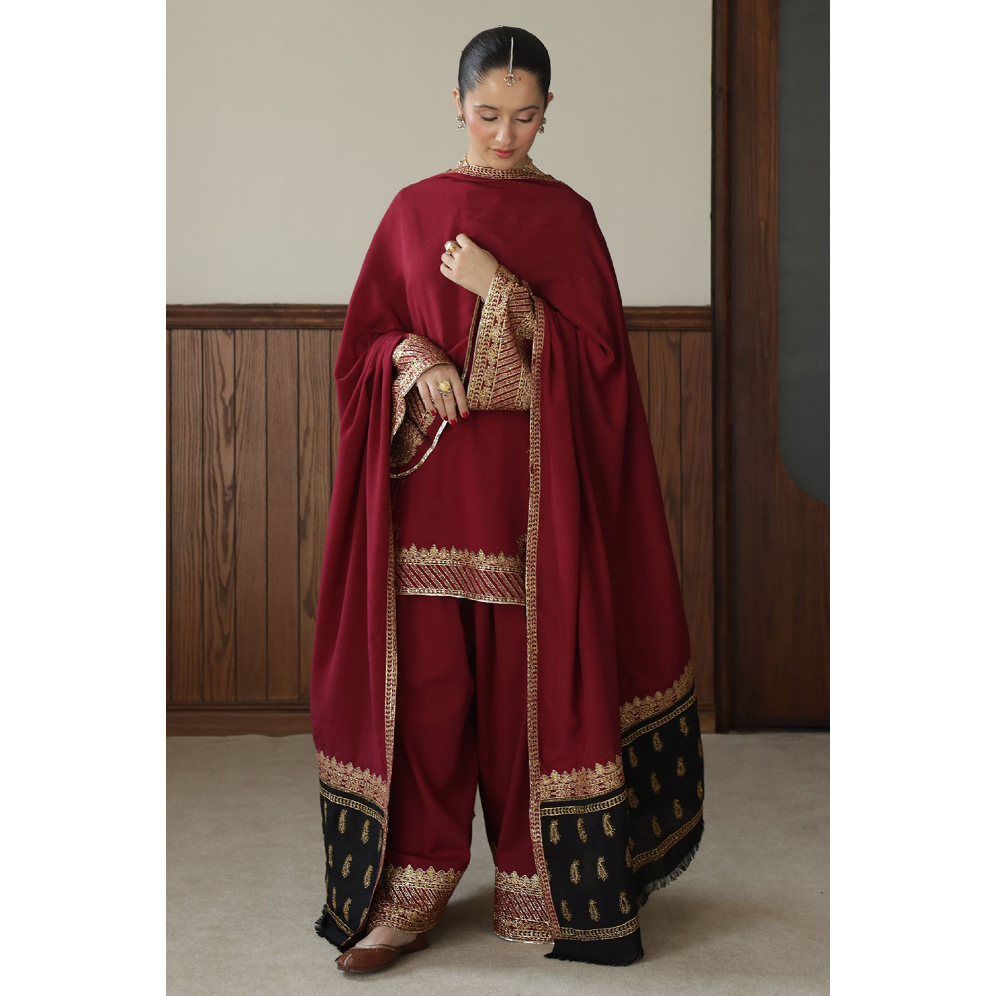 Anari slub khaddar short shirt and farshi shalwar with badla embroidery and paired with silk karandi color block shawl.