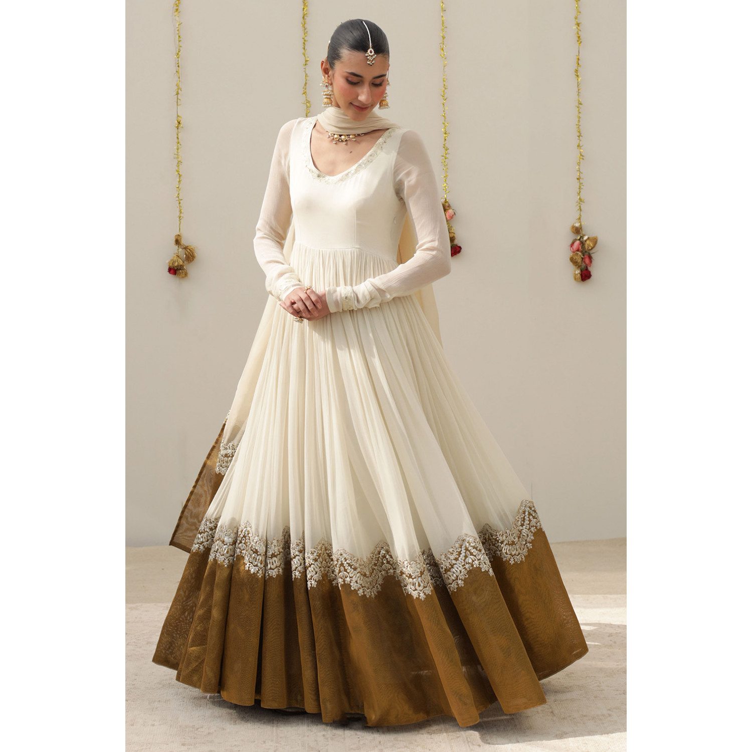 Ivory chiffon anarkali with self-resham embroidery with tissue extension paired with a similar chiffon dupatta with tissue pallu extension.
