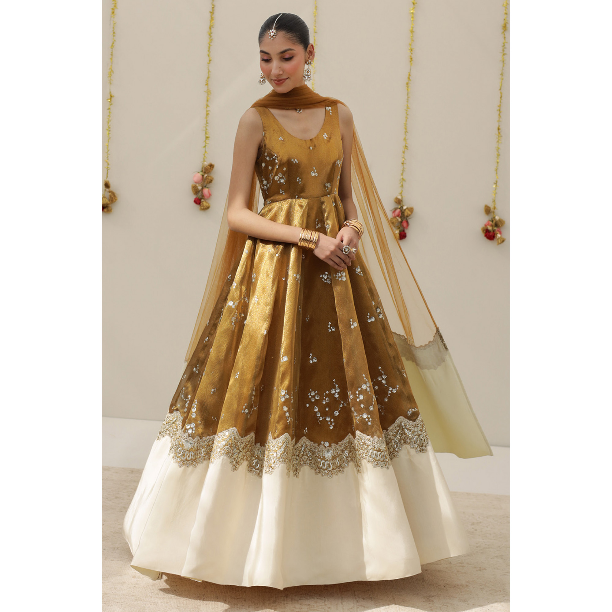 Golden tissue anarkali with white resham and sequin embroidery paired with a similar colour net dupatta and white silk extension on pallu.