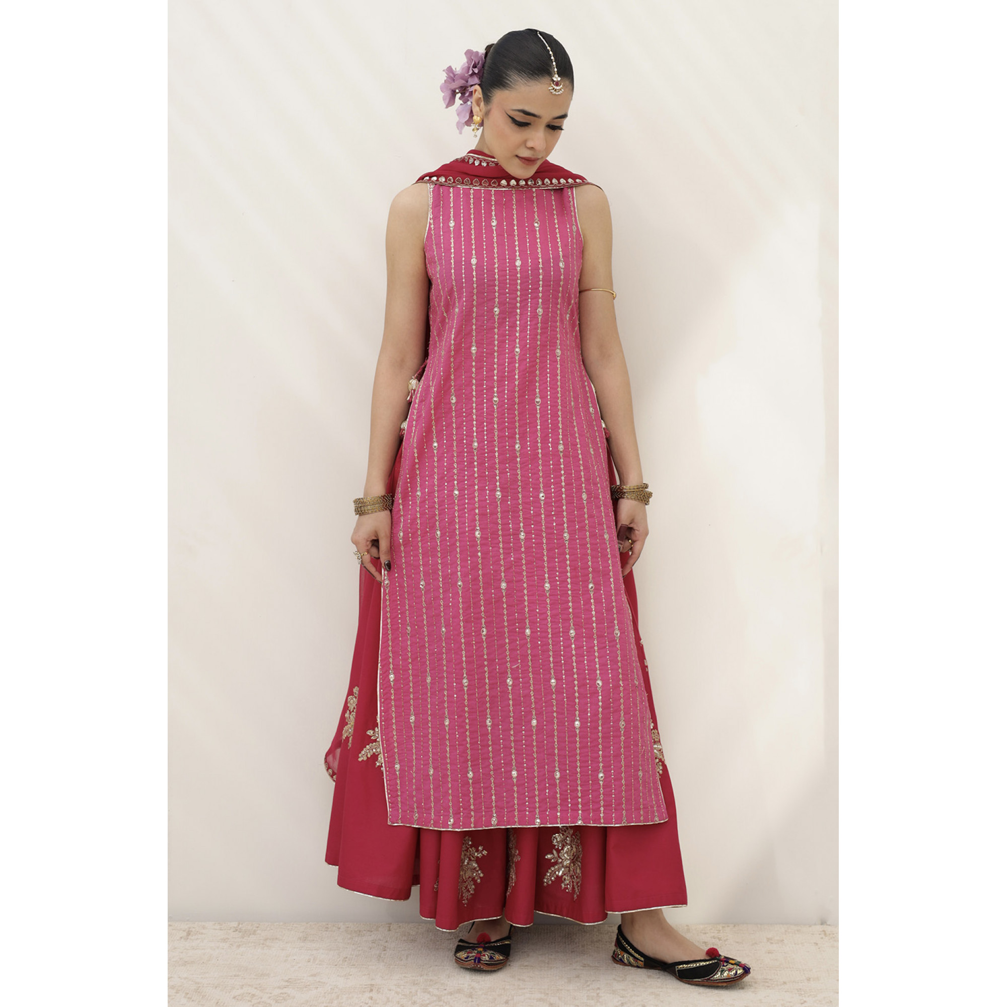 Candy pink cotton long shirt and a ghaghra cut skirt with badla, tilla and sequin embroidery paired with a candy pink chiffon dupatta.