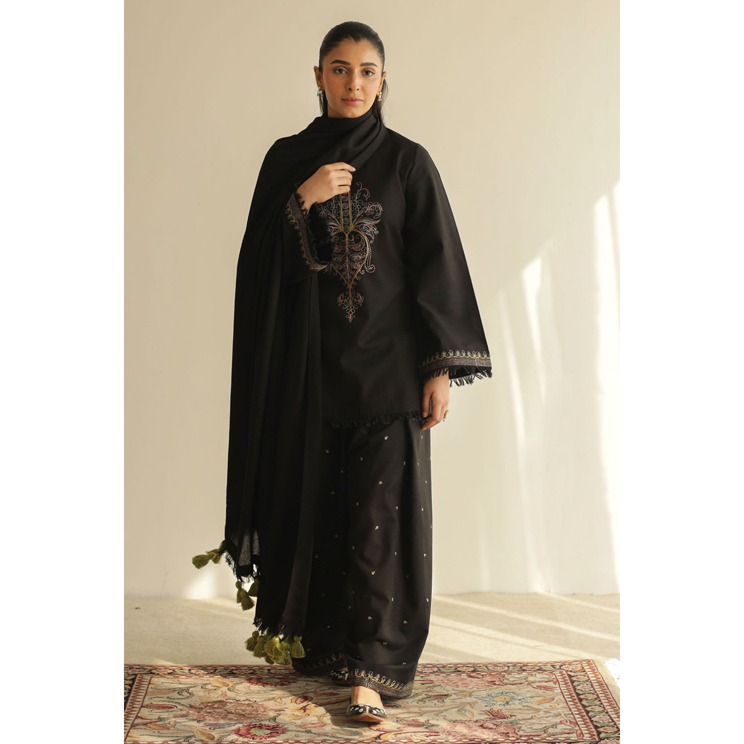 Black sooti khaddar shalwar kameez with multi-color embroidery.